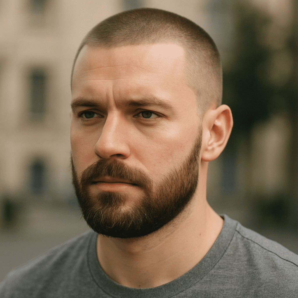 The contrast of a buzzed head and a robust beard is a striking, iconic style statement.